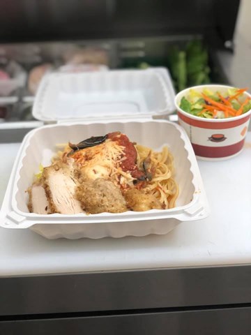 <p>with Garlic Butter Linguine, Garlic Herb Chicken Breast, & Green Salad</p>
